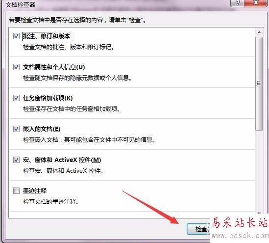7、這時會打開文檔檢查器窗口,在這里點擊下面的“檢查”按鈕