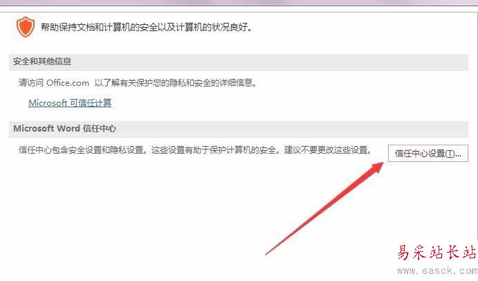 4、在右側窗口中我們找到Microsoft Word信息中心一項,點擊“信任中心設置”按鈕