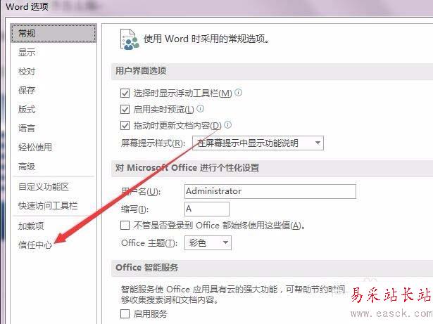 3、這時會打開Word的選項窗口,點擊左側邊欄的“信任中心”快捷鏈接