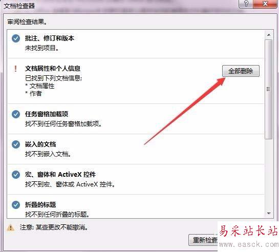 8、一會就會看到檢查結果了,點擊“文檔屬性和個人信息”一項后面的“全部刪除”按鈕,這樣就把個人信息給刪除干凈了。