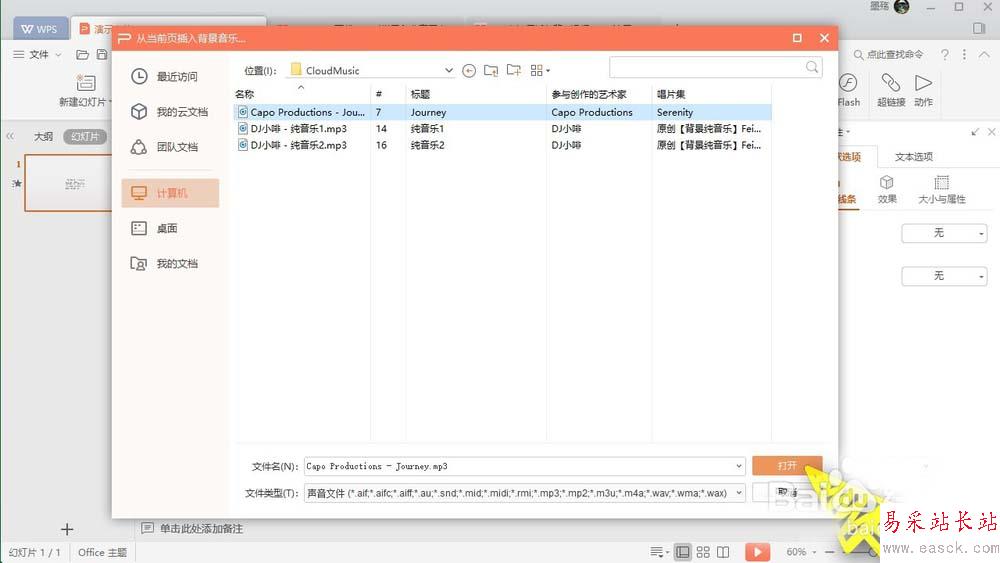 6、在我的電腦文件夾中找到自己想要插入的背景音樂,然后點擊打開,如下圖所示,