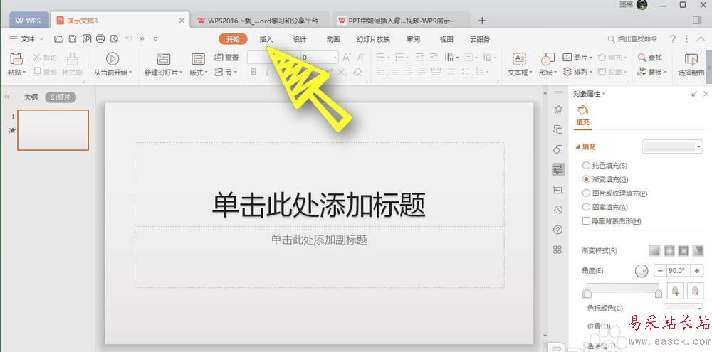 3、打開ppt文檔之后,我們點擊上方的插入選項卡,如下圖所示,