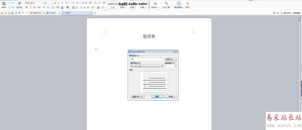 2、選擇任意一種編號形式后,點擊”自定義“,在新彈出的”自定義編號列表“中,輸入”星期“,確定。自動”星期一“……按回車鍵后,依次出現”星期二“”星期三“……