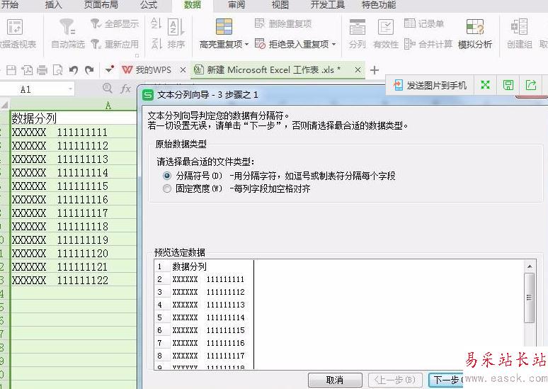 4、點擊【分列】后,進入文本分列向?qū)Т翱诮缑妫鶕?jù)文件選擇文件類型,然后進入下一步,如下圖所示
