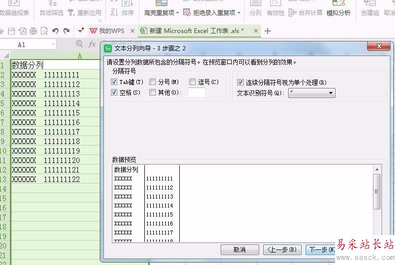 5、選擇文件類型,然后進入下一步后,切換到步驟2,根據(jù)需要,設置分割符號,設置好后點擊下一步,然后點擊完成,如下圖所示