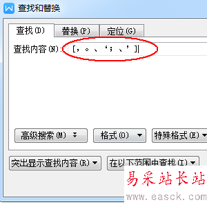 4、在查找內容中輸入[,。、‘;、’],[文中出現的所有中文符號]