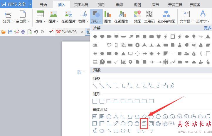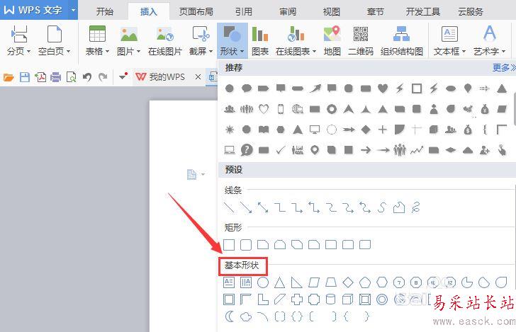 4、點擊形狀選項,在其子級菜單里找到基本形狀選,如圖所示: