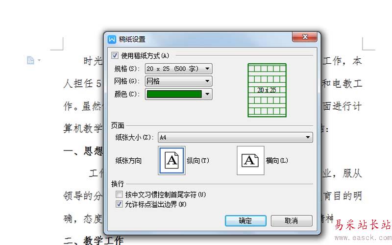 5、在該對話框中勾選使用稿紙方式選項,選擇規格,設置網格以及顏色后,點擊確定按鈕。