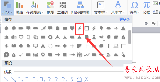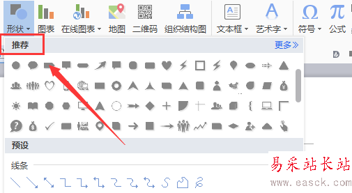 4、點(diǎn)擊形狀選項,在其子級菜單里找到推薦選項,如圖所示: