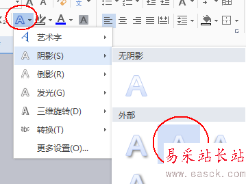 6、點(diǎn)擊“字體效果”-“陰影”-“外部”-“向下偏移”