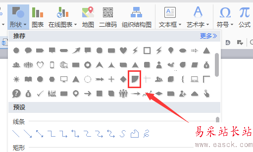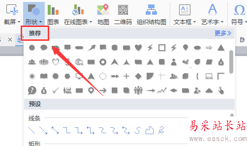 4、點擊形狀選項,在其子級菜單那里找到推薦選項,如圖所示: