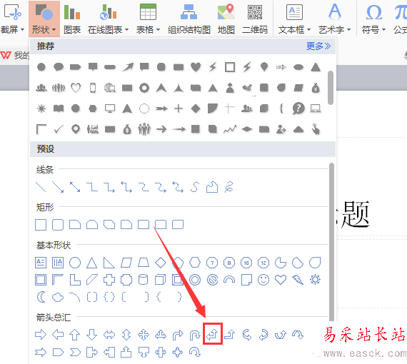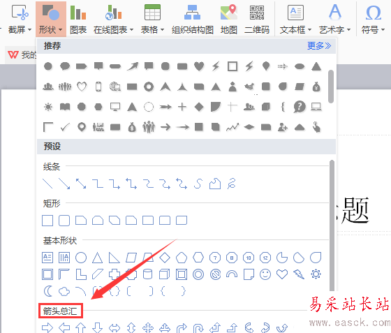 4、點擊形狀選項,在其子級菜單那里找到箭頭總匯選項,如圖所示: