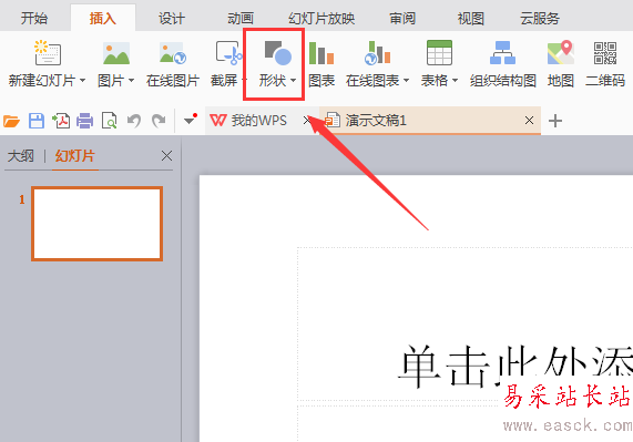 3、點擊插入選項,在其編輯工具區里找到形狀選項,如圖所示: