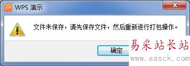 3、WPS演示的文件打包解決了當(dāng)演示文檔包含了多媒體資源時(視頻,音頻等)進行網(wǎng)絡(luò)傳輸時,另一臺計算機無法打開其中的多媒體文件。因為WPS演示保存時,只是保存了一個指向該資源的索引,并不包含該文件,所以才無法打開,只有打包的時候,才會提取相關(guān)資源進行操作。一般來說打包成壓縮文件比較好。我們直接點擊將演示文檔打包成壓縮文件。會提示我們需要要保存一下。