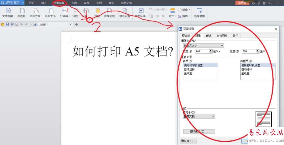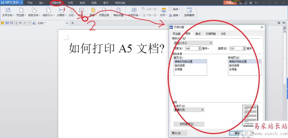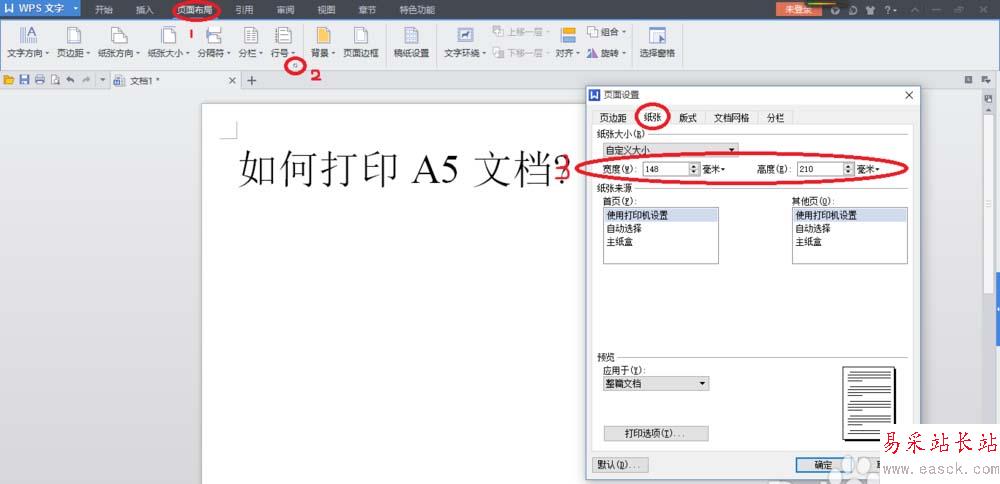 2、在打開的窗口里點擊【紙張】,接著就可以設置紙張大小了。A5紙的尺寸為 148mm*210mm,點擊【確認】即設定成功。