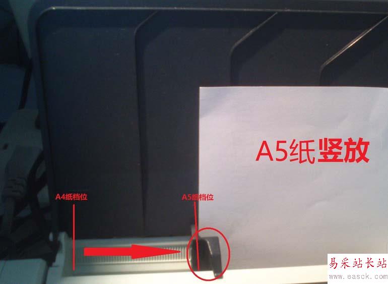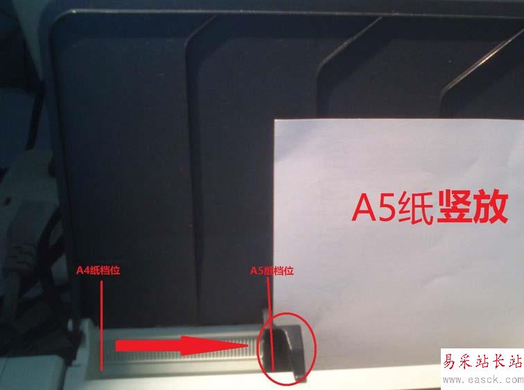 3、頁面設置完畢后,接下來我們需要調整打印機進紙口大小。認真觀察打印機進紙口,我們會發現打印機進紙口出有一處撥板,這是專門為適應不同紙張打印而設計的。將撥板如圖調整,以適應A5尺寸紙張。特別要注意的是——A5紙需要豎放!