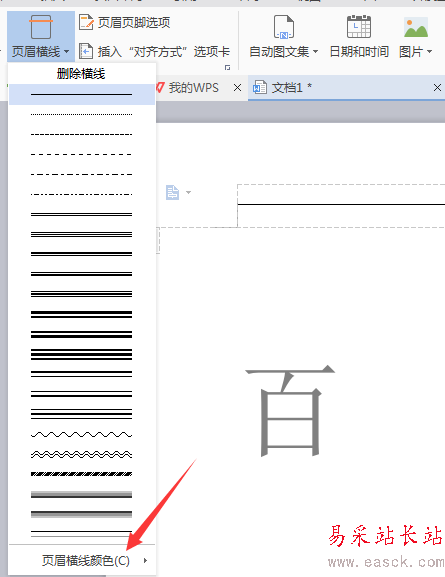 1、點擊頁眉橫線,上方彈出頁眉頁腳欄,在欄中打開“頁眉橫線”,點擊“頁眉橫線顏色”。
