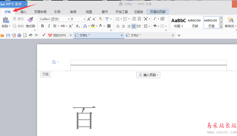 1、點擊頁眉橫線后,點擊上方“開始”。