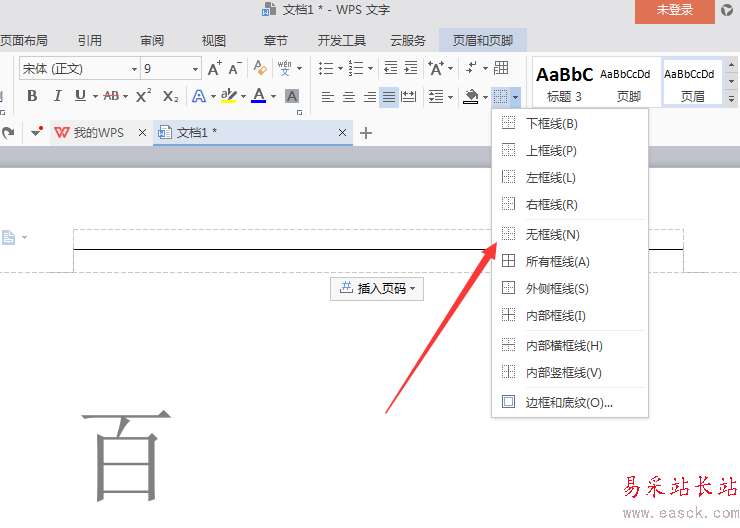 2、在“開始”欄中打開“邊框”,選擇“無邊框”。這樣頁眉橫線就沒有了。Word 2007等版本也可以通過這個方式去掉頁眉橫線。
