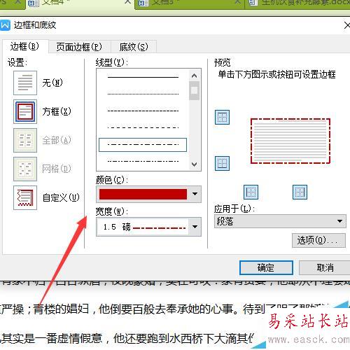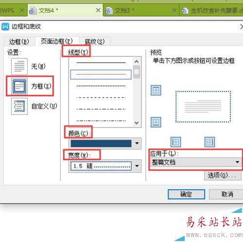 4、在【頁面邊框】編輯窗口,可設置邊框的線型、顏色、寬度等,如下圖所示: