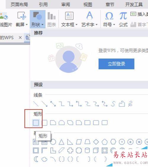 1、打開WPS文檔,在WPS文字一欄中點擊“插入”選擇“形狀”,在選擇“矩形”,如圖所示