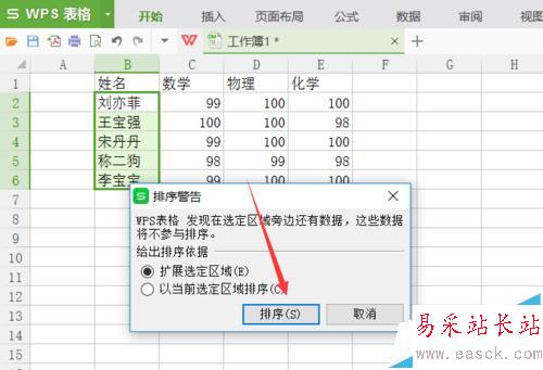 5、選擇后,wps表格默認彈出了個排序警告,這個好像沒有用,不管他,直接點擊排序,如下圖所示。