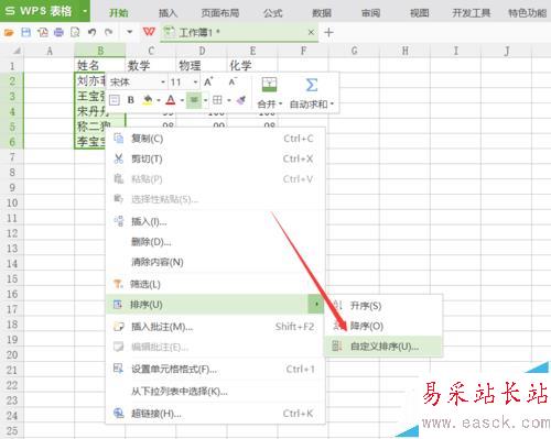 4、輸入好數據后,將姓名那列的所有值都選中,然后右鍵,選擇排序,在選擇自定義排序,如下圖所示。