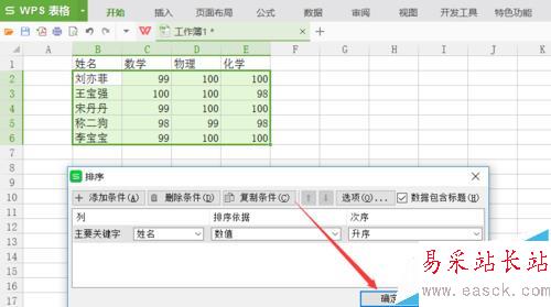 6、彈出的排序對話框里,根據需要選擇,這里選擇主要關鍵字為姓名,次序為升序,然后點擊確定,如下圖所示。