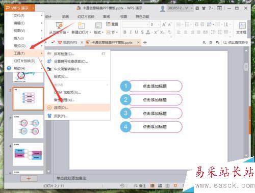 2、在打開的Wps文稿窗口,點擊左上角Wps演示下拉按鈕,在彈出的選項框中,依次點擊“工具”-->“選項”命令選項。如圖所示;
