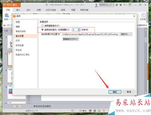 6、在備份設置選項卡的右側窗格中,選擇恢復選項下的“啟用定時備份”,并將時間間隔設置為我們需要的時間。如“5分鐘”。再點擊“確定”按鈕即可。如圖所示;