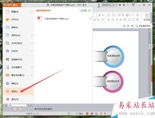 3、在打開的wps演示對話框中,選擇“選項”命令選項點擊它。如圖所示;