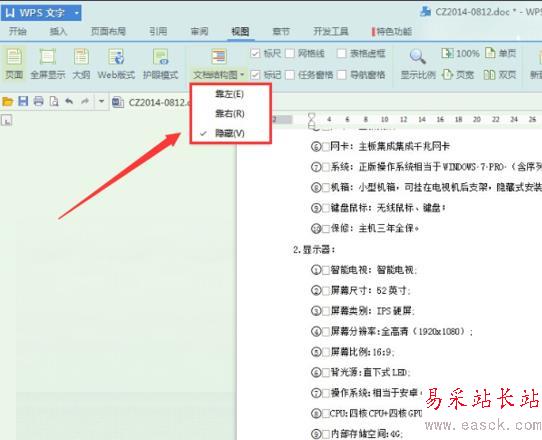 4、點擊下拉菜單里的【靠左】選項,可將文檔結構圖置于文檔左側。點擊下拉菜單里的【靠右】選項,可將文檔結構圖置于文檔右側。如下圖所示。可根據個人的操作習慣選擇合適的方式。