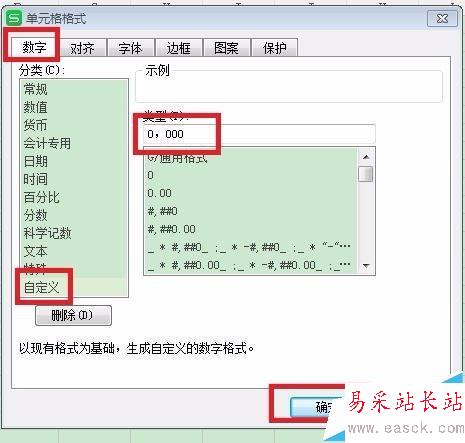 2、在彈出的對(duì)話框選擇數(shù)字——自定義——輸入0,000,最后確定。