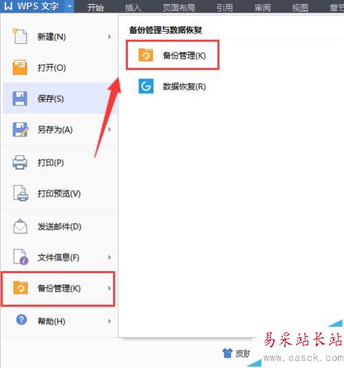 2、點擊打開,wps菜單選項,如下圖找到”備份管理“---”備份管理“功能