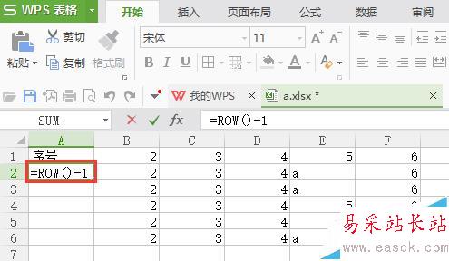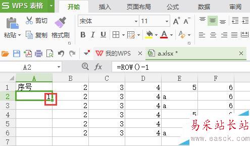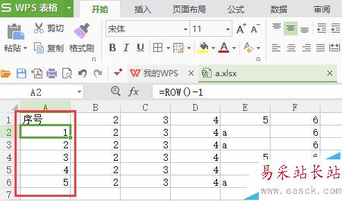 3、讓序號(hào)那一列一直連續(xù)的方法。清空序號(hào)那一列,在第一個(gè)位置輸入“=ROW()-1”,ROW()獲取當(dāng)前行號(hào)