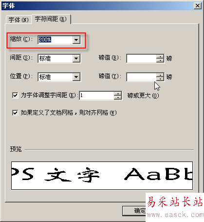 雙擊多行文字框,選中其中的“明”字,從格式菜單中選擇“字體”,在“字符間距”選項卡中將“縮放”項設置為“200%”(圖5),