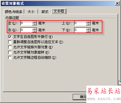 在“文本框”選項卡中“內部邊距”全部設置為“0”,下面各選項除第一項外全部設置為未選中狀態(圖4),確定退出。