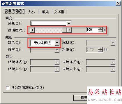 在“顏色與線條”選項卡中將“透明度”設置為100%,“線條顏色”設置為“無線條色”(圖3),