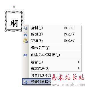 然后在文檔中拖動出一個“多行文字框”,在其中輸入“明”字。選中此文字框,右擊鼠標,調出右鍵菜單,選擇“設置對象格式”(圖2),