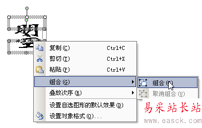 確定退出。將此多行文字框復制一份,將第二個文字框中的“明”字改為“空”字,至此,“曌”字的兩個部分就準備好了。用鼠標調整兩個文字框到合適的位置,用 “繪圖”工具欄中的“選擇對象”工具,同時選中兩個文字框,點擊鼠標右鍵,在右鍵菜單中執行“組合-組合”(圖6),即完成了字符的合并。