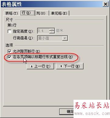 按下“Ctrl+V”快捷鍵,可以看到,粘貼過來的表格已經自動分成三欄顯示了。美中不足的是后面的兩欄沒有標題行。不過,加上標題行并不難。選中第一欄中的標題行,點擊右鍵,在彈出的快捷菜單中選擇“表格屬性”命令,打開“表格屬性”對話框。點擊“行”選項卡,選中“在各頁頂端以標題行形式重復出現”復選項,如圖4所示。確定后,每欄的表格就會自動添加這個標題行了。