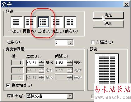 首先選中金山表格中的所有數據,按下“Ctrl+C”鍵進行復制。然后打開金山文字,新建一個文件,點擊菜單命令“格式→分欄”,在打開的“分欄”對話框中設置分三欄,如圖3所示。