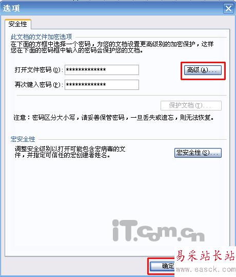 此時(shí)會(huì)調(diào)出一個(gè)選項(xiàng)窗口,你可以直接輸入自己的密碼,按確定按鈕就搞定,系統(tǒng)會(huì)自動(dòng)按照默認(rèn)的密碼標(biāo)準(zhǔn)為你加密,如果你覺(jué)得還不放心的話,你可以點(diǎn)擊高級(jí)選項(xiàng),選擇其他的密碼標(biāo)準(zhǔn),如圖2、圖3所示: