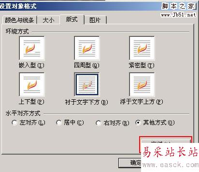 5、選擇圖片的“版式”為“襯于文字下方”,并點擊“高級按鈕”。