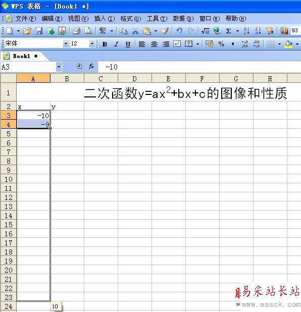3、分別在A3、A4單元格內輸入“-10”、“-9”,拖動鼠標選中這兩個單元格后,將鼠標移動到單元格右下角的填充柄(就是那個黑色的小方塊)上,當鼠標指針變成黑色十字形時,按住鼠標左鍵向下拖動(如圖2)到A23單元格,這樣我們就利用WPS表格中的快速輸入法完成了自變量x值的輸入。