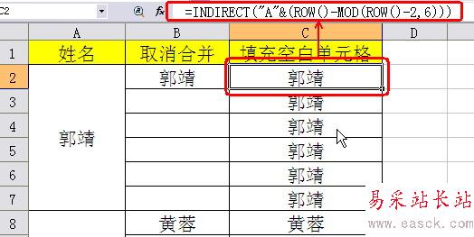 “"A"&2”可以得到合并字符串“A2”。而INDIRECT函數的作用就是返回指定單元格的數據,如本例中“=INDIRECT(A2)”的結果就是“郭靖”。