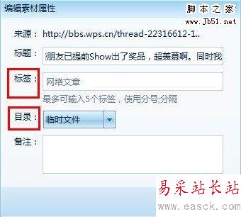 對了,點擊中間的“編輯”按鈕,可以對該素材的屬性進行編輯,如“標簽”、 “保存目錄”什么的,如圖 5 所示。
