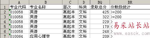 當時我們需要按層次和科類來實現各專業線下5分及上線人數的統計。數據透視表中的按步長統計功能不能很好實現此效果,故我決定采用建立一輔助列來幫助數據透視表快速完成統計功能,該列取名為:“分數段統計”