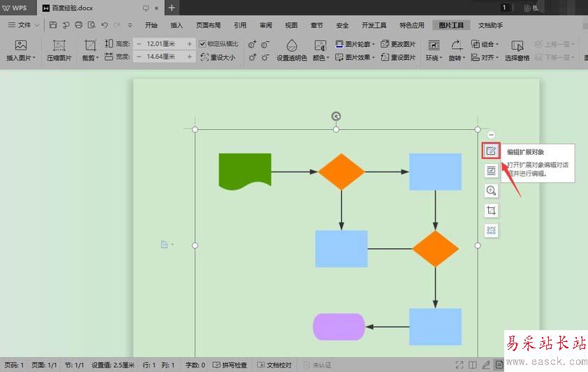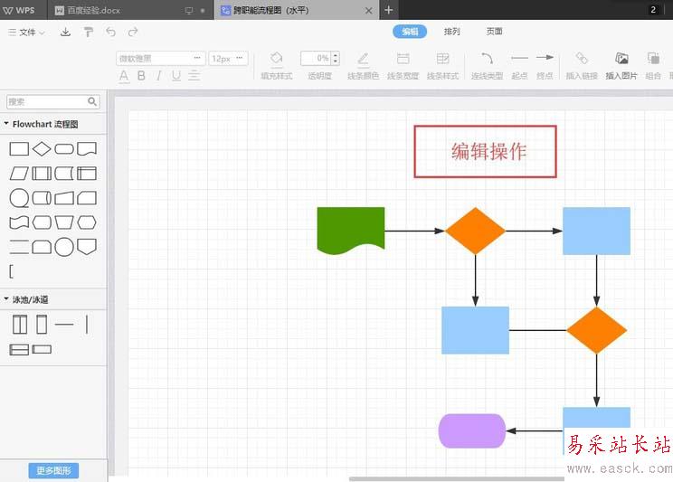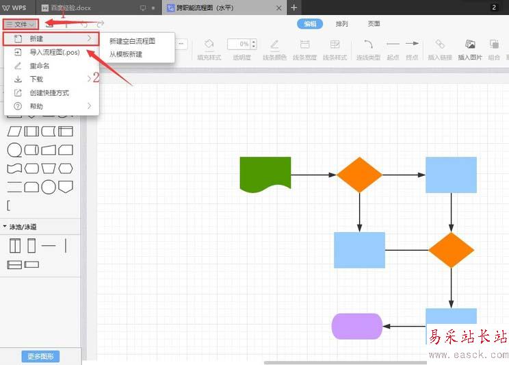6、選中文檔已插入的流程圖,點擊右側的“編輯”,進入流程圖編輯界面后選擇“文件”→“新建”,即可進入新的“新建流程圖”界面。