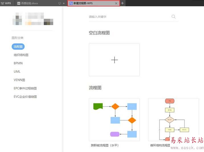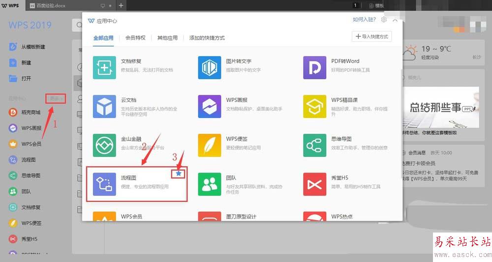 2、在WPS首頁左側“應用中心”選擇“流程圖”可以直接打開步驟1的圖3(應用中心未顯示該項的可在“更多”中找到相應功能點擊右上角的星標添加)